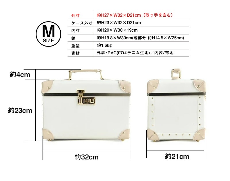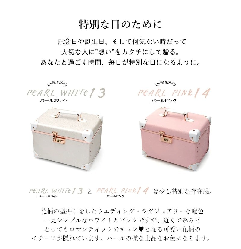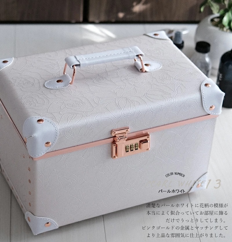 トランクモチーフのおしゃカワいいBOX♪気軽に持ち運べてどこでも素敵なドレッサー空間を演出収納力もしっかりと確保したコスメボックス キレイを作る道具を入れるものだから気軽に使えて・デザインにこだわり・長く綺麗に使える 取っ手付きで持ち運びも気軽にしていただけられるこちらのコスメボックス。トランクモチーフのデザインとなっており、レトロの雰囲気と可愛さを併せ持つ仕上がりに♪ 女性にとって日々使うメイクボックス。長く綺麗に使って頂くために底面に底鋲を配置しました。底面の磨耗や汚れ・傷などを防ぎ綺麗を保っていただけますので長く綺麗にお使いいただけます。 ワイドに広くたっぷりと収納も可能♪ ワイドに十分な大きさを確保しており、たっぷりと収納していただくことができ、パッと収納状態を見ることができますので、出し入れもしやすくストレスなくお使いいただけます。散らばりやすい小物の収納に最適なギャザーポケット付きで収納力もしっかりと確保。 印象に残る深い色合いから淡い優しい配色とこだわったカラーをご用意 汚れや傷をしっかりと防止する便利な不織布カバー付き 長く綺麗にお使いいただけるように不織布カバーを付けてお送りいたします。 保管時の汚れや傷の防止ができ、より長く綺麗にお使いいただけます。 様々なシーンでご使用OK!趣味で使う物の収納にも♪ 気軽に持ち運べるサイズ感となっており、 メイクボックスを抱えての移動などがある美容関係のお仕事の方やアクセサリーなどのDIYが趣味の方も大切な作品を細かく保管していただくことができ大変おすすめの商品となっております。