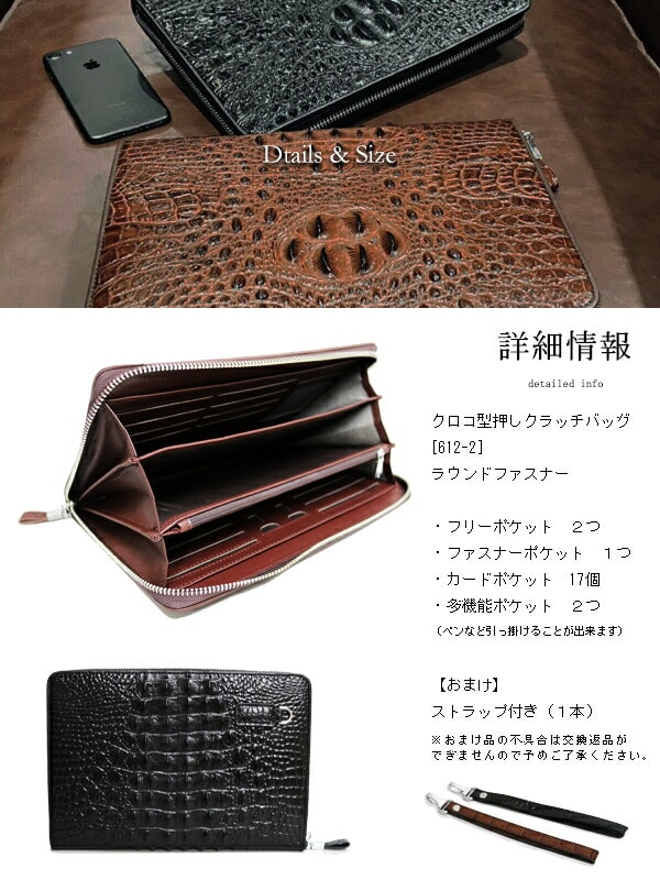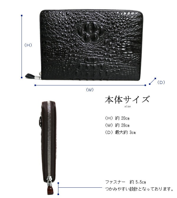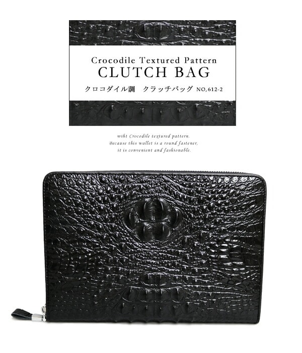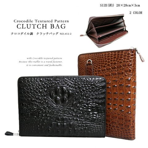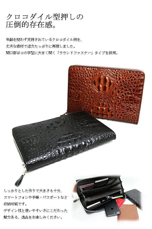 クロコダイル型押しの圧倒的存在感。年齢を問わず支持されているクロコダイル柄。 デザイン性と使いやすさにこだわった魅力ある逸品です。 しっかりとした作りで大きさも十分で収納力も抜群です。 深さがあるので薄手の長財布やパスポートなどのも収納可能です。