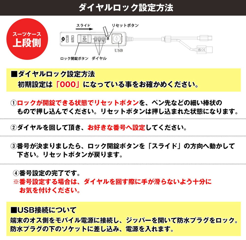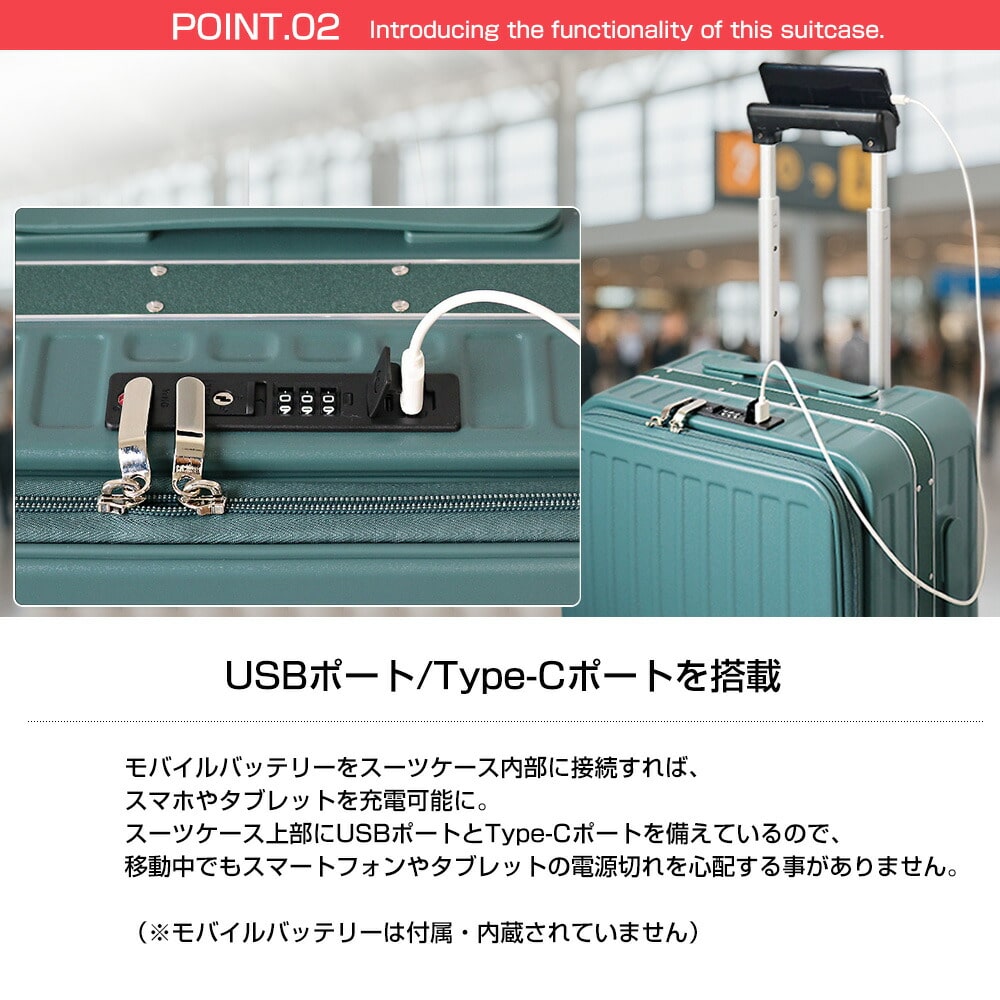 モバイルバッテリーをスーツケース内部に接続すれば、スマホやタブレットを充電可能に。スーツケース上部にUSBポートとType-Cポートを備えているので、移動中でもスマートフォンやタブレットの電源切れを心配する事がありません。