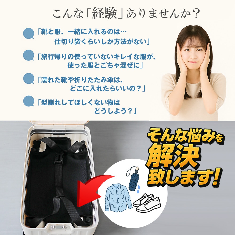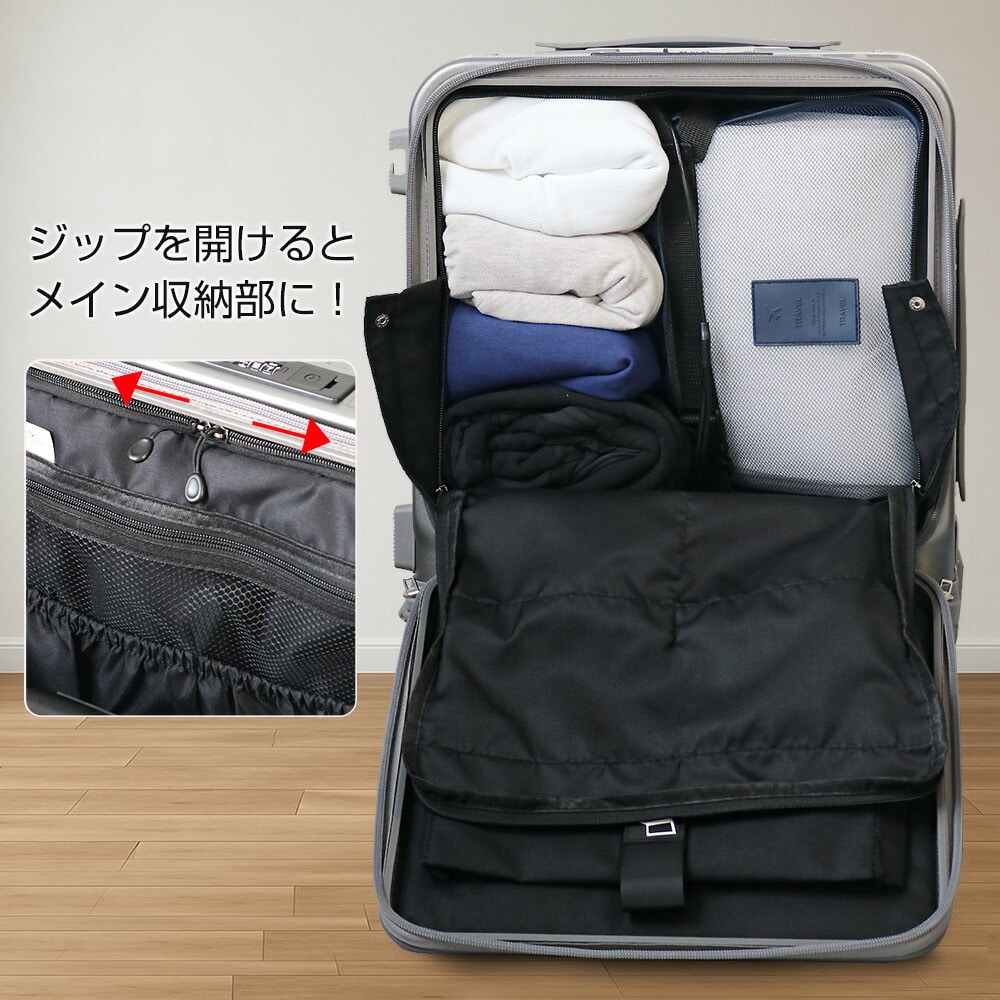 使いやすさにもこだわりを。移動先でもスーツケースを立てたまま、ノートPCや書類を簡単に取り出せるよう、スーツケース前面が開くフロントオープン構造を採用。よく使用するノートPCやチケット・化粧ポーチやガジェット類など、すぐに取り出す小物類を前面に。さらにその奥のスペースには、あまり人目に付きたくない、着替えや下着などを収納できるメイン収納部の2重構造となっております。