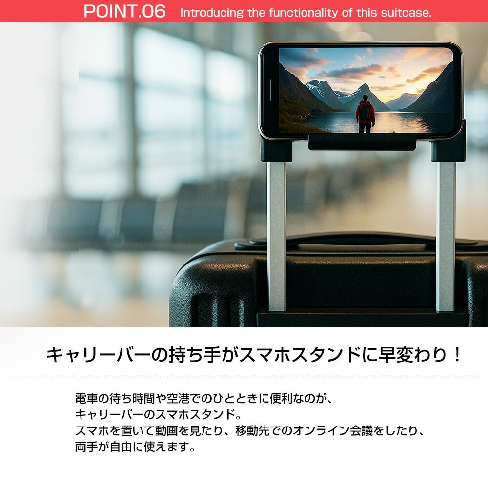 電車の待ち時間や空港でのひとときに便利なのが、キャリーバーのスマホスタンド。スマホを置いて動画を見たり、移動先でのオンライン会議をしたり、両手が自由に使えます。