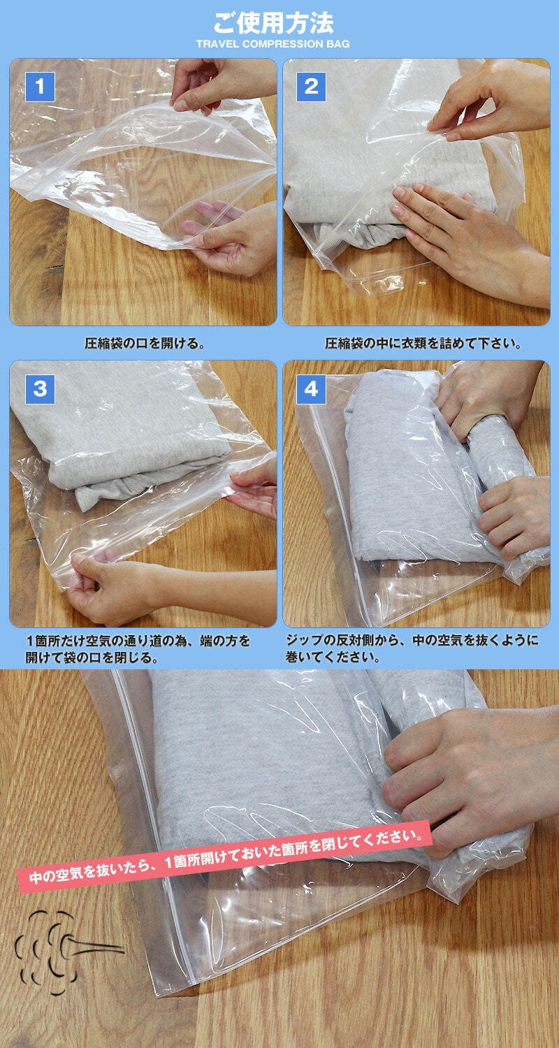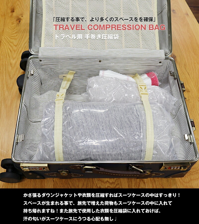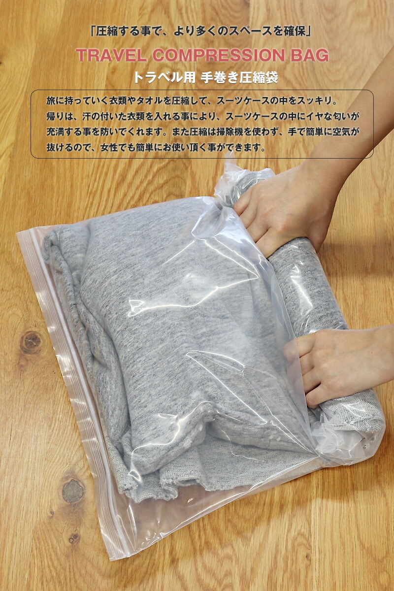 【圧縮する事で、より多くのスペースを確保】 旅に持っていく衣類やタオルを圧縮して、スーツケースの中をスッキリ。 帰りは、汗の付いた衣類を入れる事により、スーツケースの中にイヤな匂いが充満する事を防いでくれます。 また圧縮は掃除機を使わず、手で簡単に空気が抜けるので、女性でも簡単にお使い頂く事ができます。 ※素材は、厚手のビニールになります。破れたり穴が開いたりする事もございますので、あくまで使い捨てタイプとお考えください。 メール便にてお届けしますが、追跡番号はございません。 ※メール便でのお届けをご希望の場合、お支払い方法は クレジットカードか銀行振込に限らせて頂きます。 (メール便は代引きが使えないため)