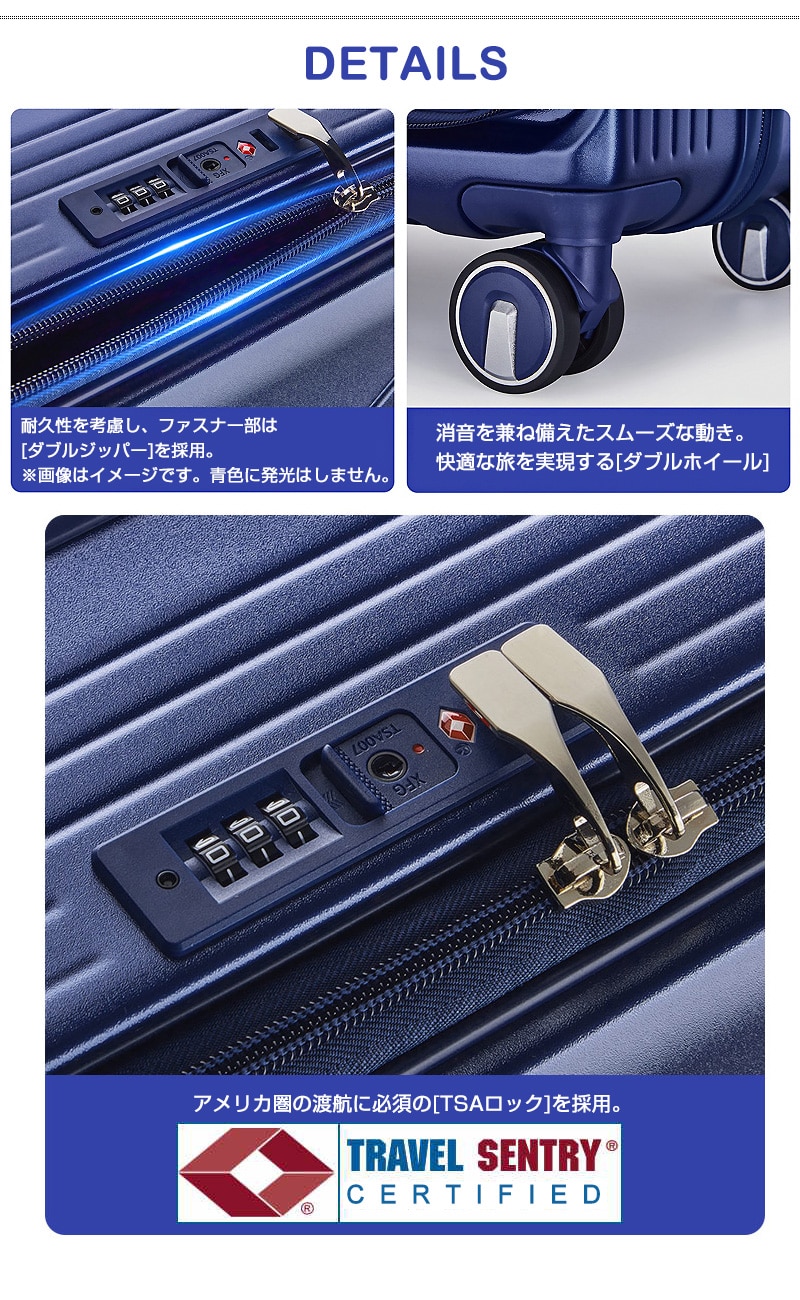 また、アメリカ圏の旅行者にとって便利なTSAロックを標準装備。