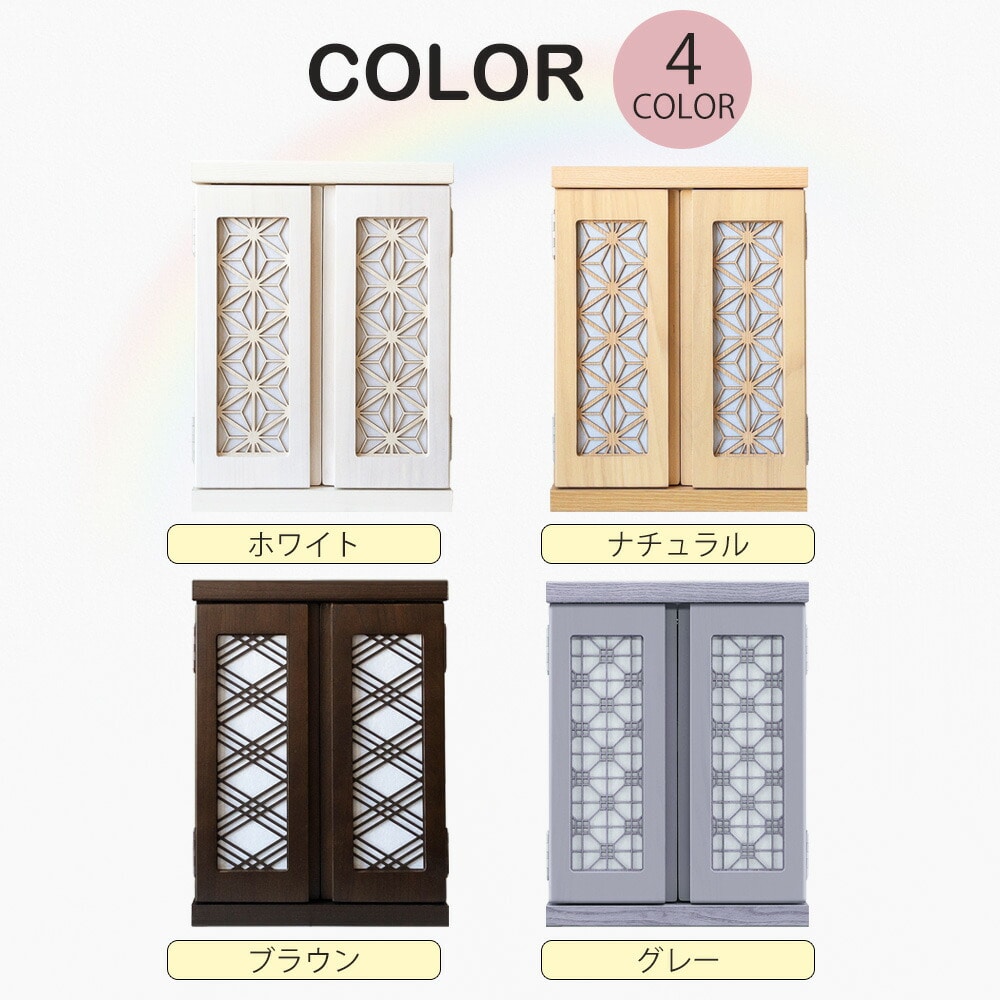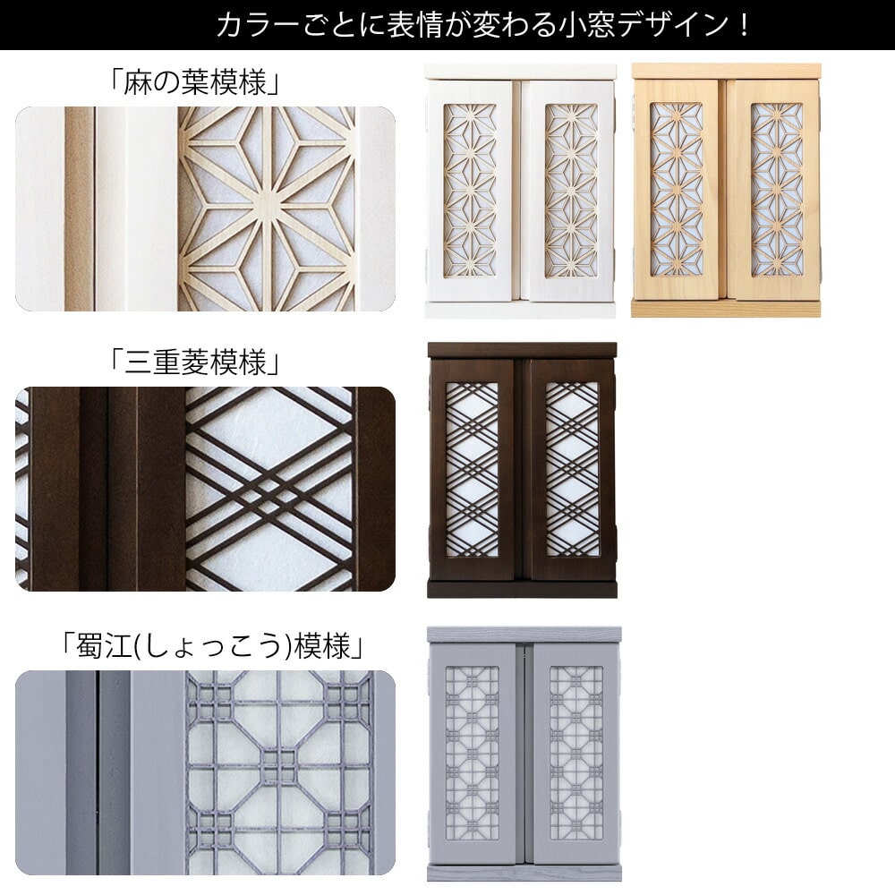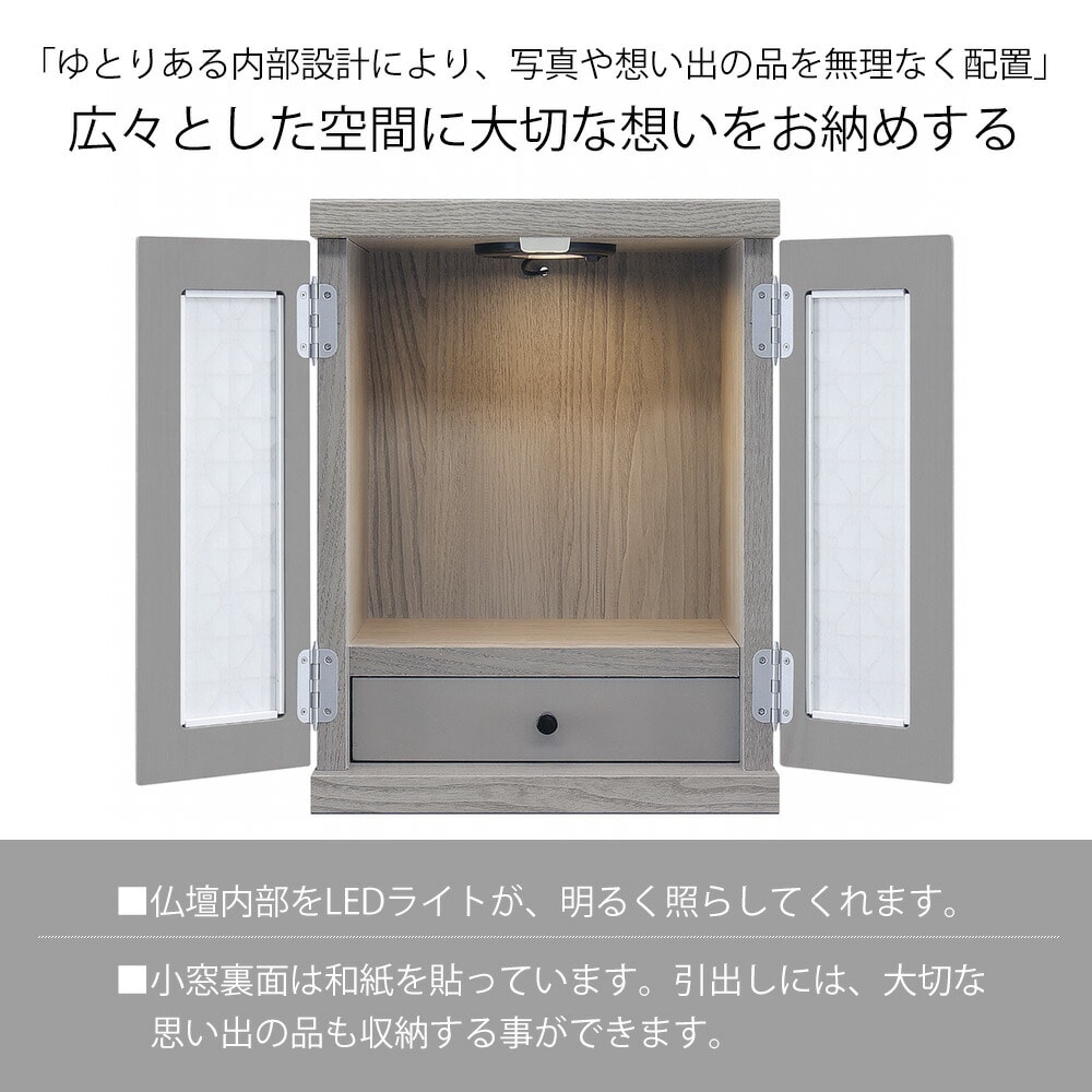 扉のデザインにはモダンな和柄を採用し、 扉を閉じればお部屋の家具と統一感が出て、 生活感を隠しながら自然に置ける“インテリア仏壇”としても人気です。