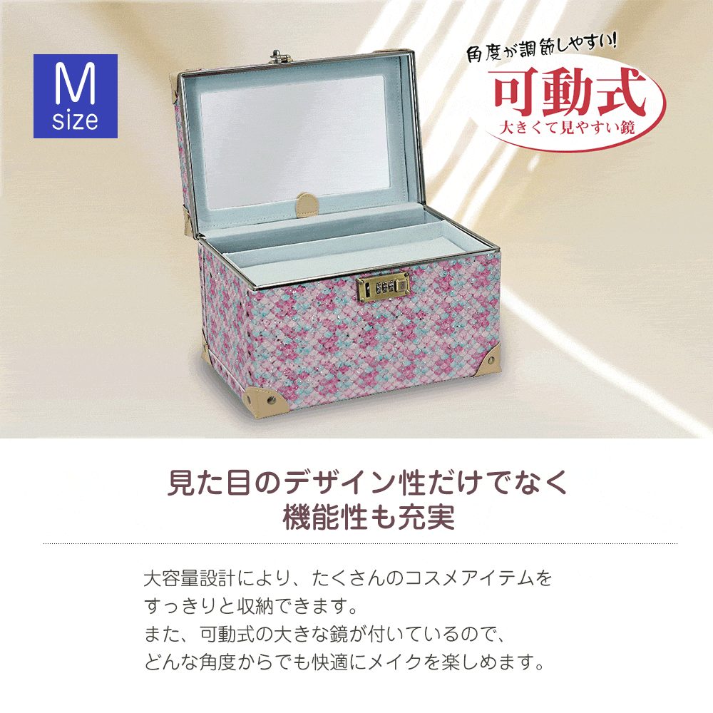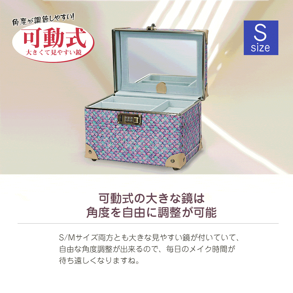 S/Mサイズ両方とも大きな見やすい鏡が付いていて、自由な角度調整が出来るので、毎日のメイク時間が待ち遠しくなりますね。