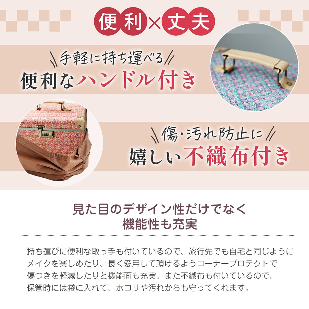 持ち運びに便利な取っ手も付いているので、旅行先でも自宅と同じようにメイクを楽しめたり、長く愛用して頂けるようコーナープロテクトで傷つきを軽減したりと機能面も充実。また不織布も付いているので、保管時には袋に入れて、ホコリや汚れからも守ってくれます。
