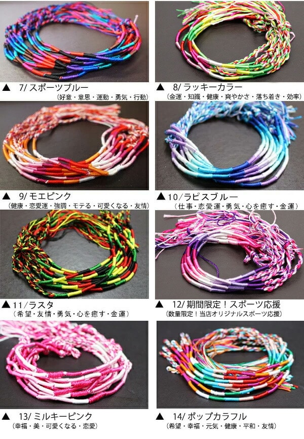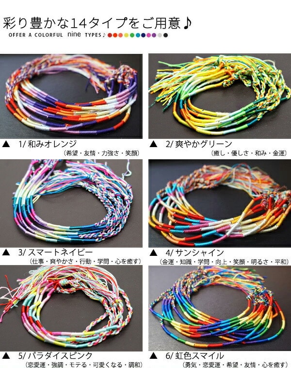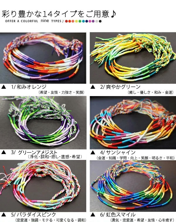 お守りの一種で手首や足首に巻き自然に切れたら願いがかなうと言われているミサンガ♪ アジアンテイストでスタイルを選ばないデザイン。日本ではJリーグの選手から人気がでて 今でも人気商品です。 ファッション性も高く、サマーシーズンには強力なアイテムに! カップル、友達とおそろいでつけるのも♪ アンクレットとしてもオススメです。穴に通して着けるタイプで簡単装着。