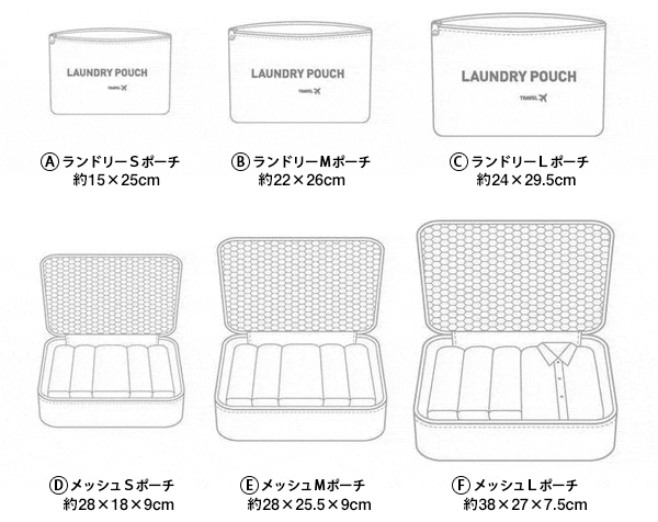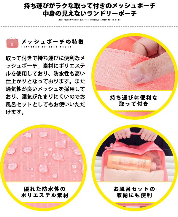 嬉しい6点セット♪大小のサイズでスーツケースの中も綺麗スッキリ 持ち運びがラクな取って付きのメッシュポーチ 取って付きで持ち運びに便利なメッシュポーチ。素材にポリエステルを使用しており、防水性も高い仕上がりとなっております。また通気性が良いメッシュを採用しており、湿気がたまりにくいのでお風呂セットとしてもお使いいただけます。 中身の見えないランドリーポーチ 中身が見えずファスナーで止めるタイプのランドリーポーチ。こちらもポリエステルの素材で出来ており防水性に優れております。バラバラになりやすい小物の整理や使用済みのタオルなどの収納に大変便利となっております。