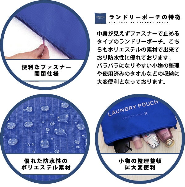 中身が見えずファスナーで止めるタイプのランドリーポーチ。こちらもポリエステルの素材で出来ており防水性に優れております。バラバラになりやすい小物の整理や使用済みのタオルなどの収納に大変便利となっております。