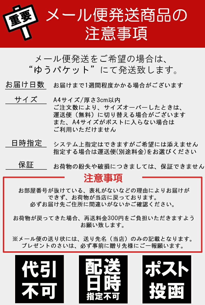 ■メール便の場合、一切の保証はございません。破損・紛失の可能性も ございますので運送便をお勧めします。