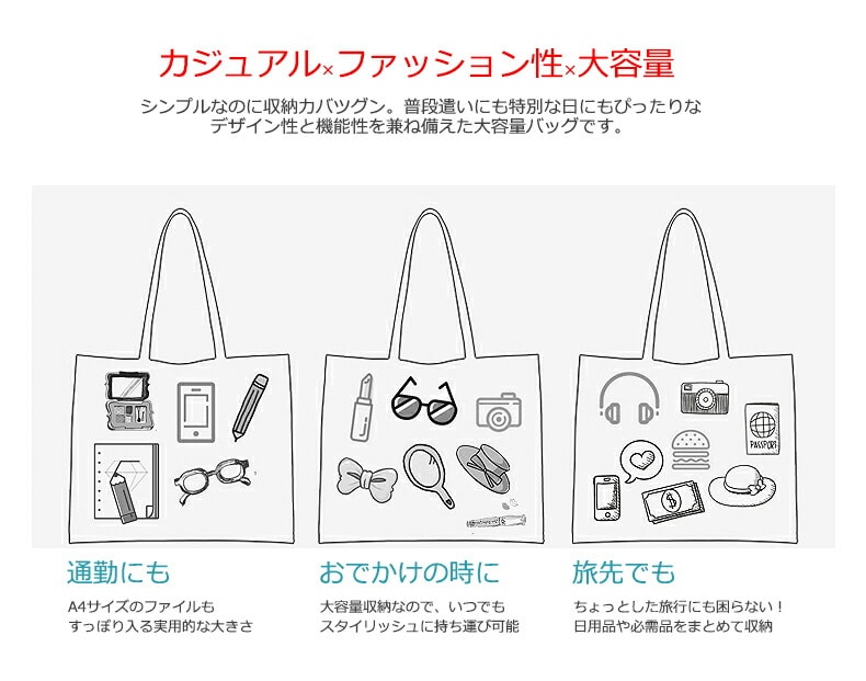 シンプルデザインなのに大容量! 世界中で大注目の手提げカバンです。 柔らかく、かつ、しっかりとした感触のポリエステル生地。 スタイリッシュな魅力とエレガントさを兼ね備えた素材です。 持ち手は使いやすさにこだわった柔らかな縫製。 耐久性もあるので、普段遣いにぴったり。 シンプルなのに収納力バツグン。普段遣いにも特別な日にもぴったりな デザイン性と機能性を兼ね備えた大容量バッグです。 通勤にも・・・ modeサイズのファイルも すっぽり入る実用的な大きさ おでかけの時に・・・ 大容量収納なので、いつでも スタイリッシュに持ち運び可能 旅先でも・・・ ちょっとした旅行にも困らない! 日用品や必需品をまとめて収納 タブレット、mode雑誌、ウォレット、カメラ、化粧品など 普段使うものを何でも収納!!