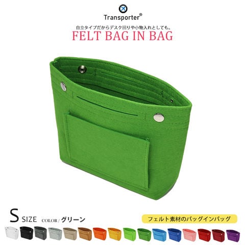 上質で厚手のフェルト生地を素材に使った全16カラーのバッグインバッグ。 普段持ち歩いている化粧品や小物類。カバンの中でどこにいったか探すのが一苦労・・・ そんな時に重宝するのが、小物類を上手に仕分けできるこちらのバッグ! 厚手のフェルト生地だから型崩れがしにくく、そのまま普段お使いのトートバッグなどにスッポリ収まる優れもの。整理整頓が簡単に出来ますよ。 さらにこちらのバッグ。バッグとしてだけではなく小物入れとしてもお使い頂けます。そのまま自立してくれるので、デスク回りの筆記用具入れとして、またリビングのちょっとした小物入れとしてお使いいただくのもおススメです。 サイズはSサイズ・Mサイズの2種類をご用意。普段お使いのカバンサイズに合わせてお選び頂けます。 ※こちらのページはSサイズです。