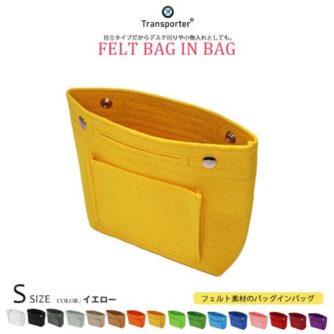 上質で厚手のフェルト生地を素材に使った全16カラーのバッグインバッグ。 普段持ち歩いている化粧品や小物類。カバンの中でどこにいったか探すのが一苦労・・・ そんな時に重宝するのが、小物類を上手に仕分けできるこちらのバッグ! 厚手のフェルト生地だから型崩れがしにくく、そのまま普段お使いのトートバッグなどにスッポリ収まる優れもの。整理整頓が簡単に出来ますよ。 さらにこちらのバッグ。バッグとしてだけではなく小物入れとしてもお使い頂けます。そのまま自立してくれるので、デスク回りの筆記用具入れとして、またリビングのちょっとした小物入れとしてお使いいただくのもおススメです。 サイズはSサイズ・Mサイズの2種類をご用意。普段お使いのカバンサイズに合わせてお選び頂けます。 ※こちらのページはSサイズです。