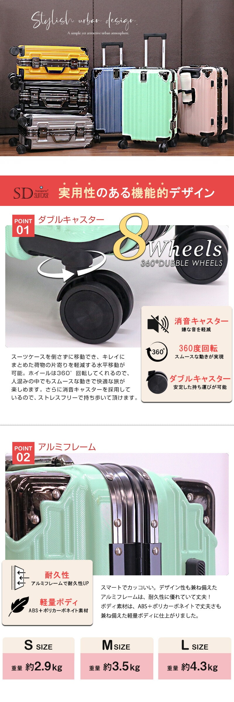 さらに消音キャスターを採用しているので、ストレスフリーで持ち歩いて頂けます。