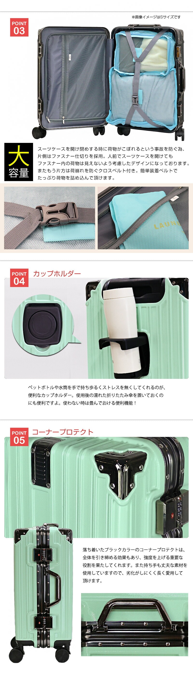 スーツケースを開け閉めする時に荷物がこぼれるという事故を防ぐ為、片側はファスナー仕切りを採用。