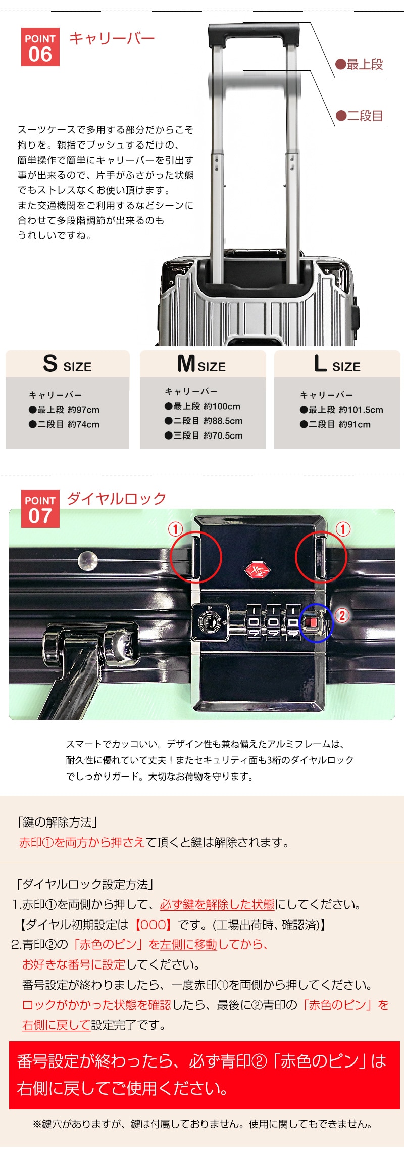 またセキュリティ面も3桁のダイヤルロックでしっかりガード。大切なお荷物を守ります。