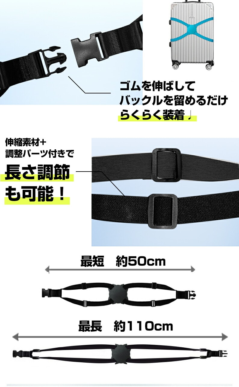 ゴム素材だから、 パッと5秒で簡単に取り付け可能!荷崩れや盗難を防ぎ、空港のターンテーブルで荷物探しもラクラク!