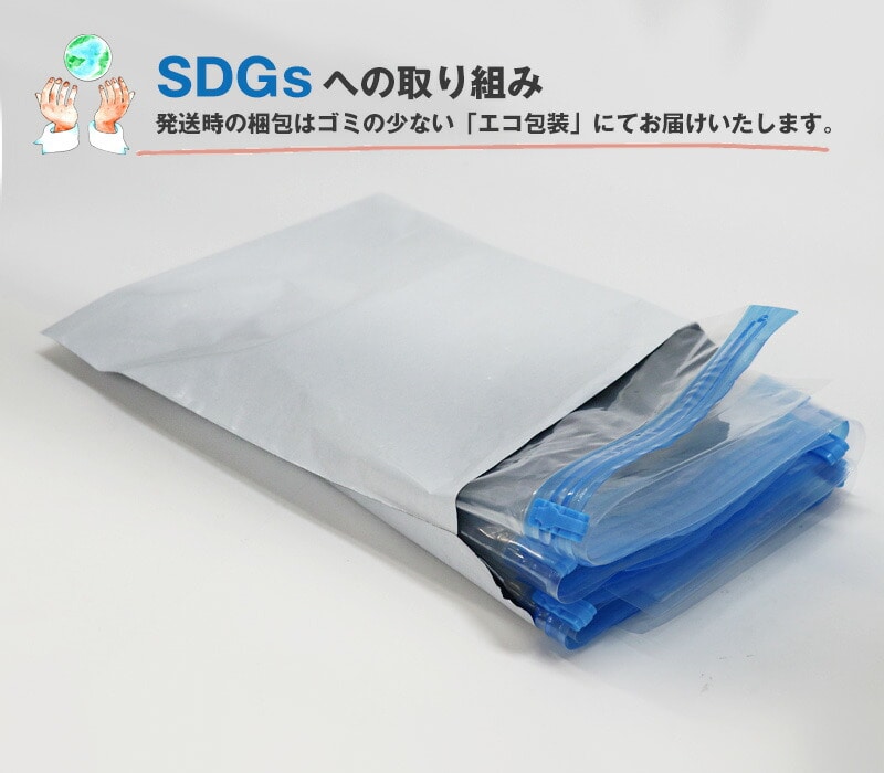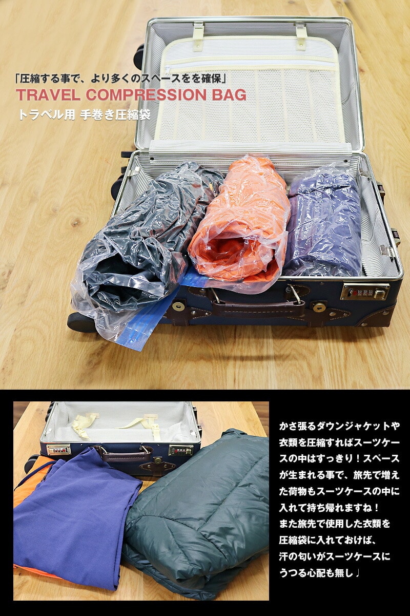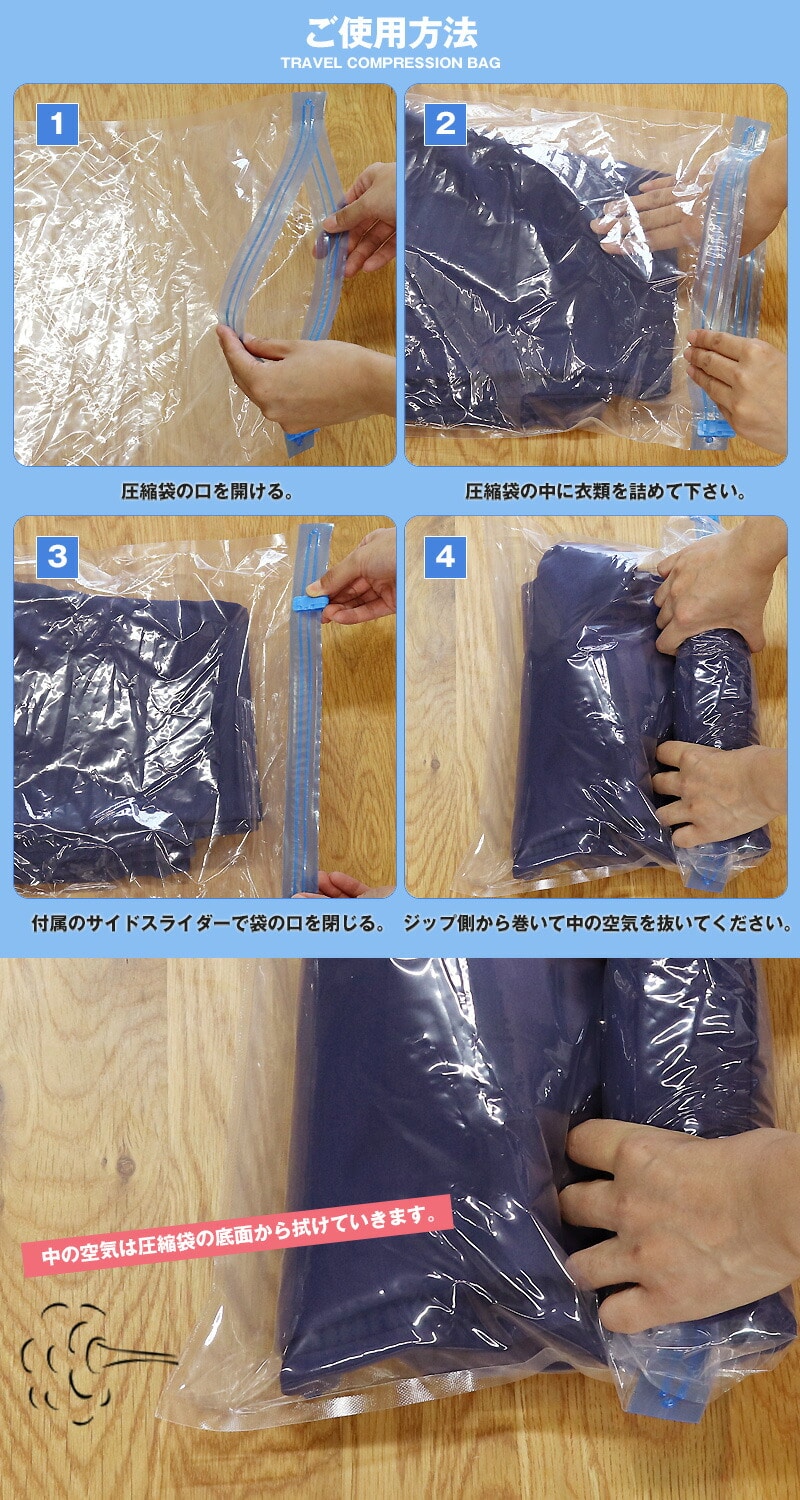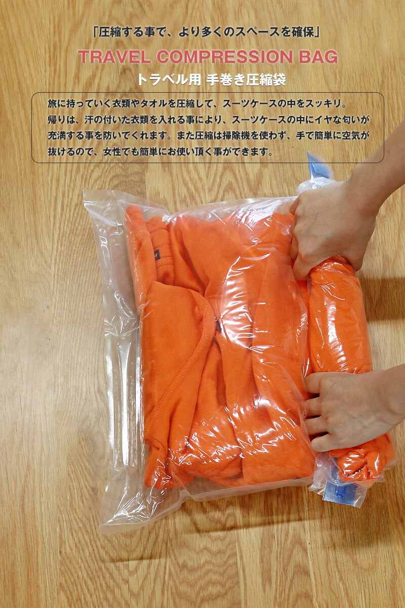 【圧縮する事で、より多くのスペースを確保】 旅に持っていく衣類やタオルを圧縮して、スーツケースの中をスッキリ。 帰りは、汗の付いた衣類を入れる事により、スーツケースの中にイヤな匂いが充満する事を防いでくれます。 また圧縮は掃除機を使わず、手で簡単に空気が抜けるので、女性でも簡単にお使い頂く事ができます。 ※素材は、厚手のビニールになります。破れたり穴が開いたりする事もございますので、あくまで使い捨てタイプとお考えください。 メール便にてお届けしますが、追跡番号はございません。 ※メール便でのお届けをご希望の場合、お支払い方法は クレジットカードか銀行振込に限らせて頂きます。 (メール便は代引きが使えないため)