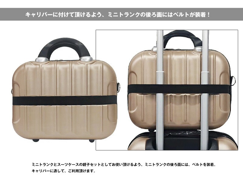 ミニトランクの後ろ面にはキャリーバーに固定できるベルトが付いているので、 キャリーオンケースとしてお使い頂けます。
