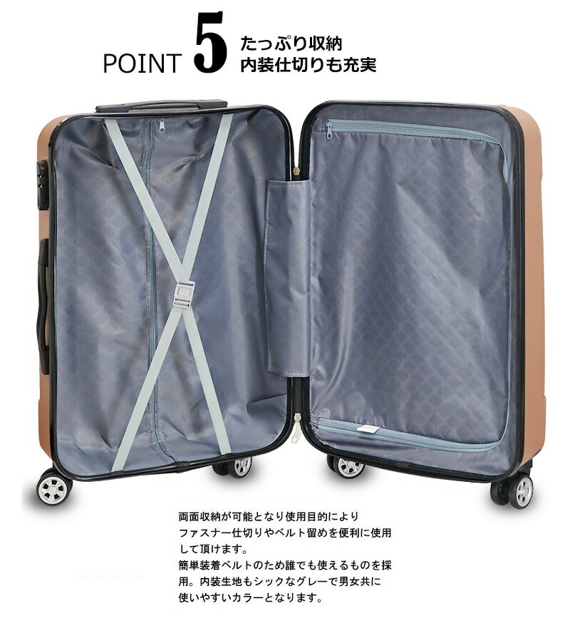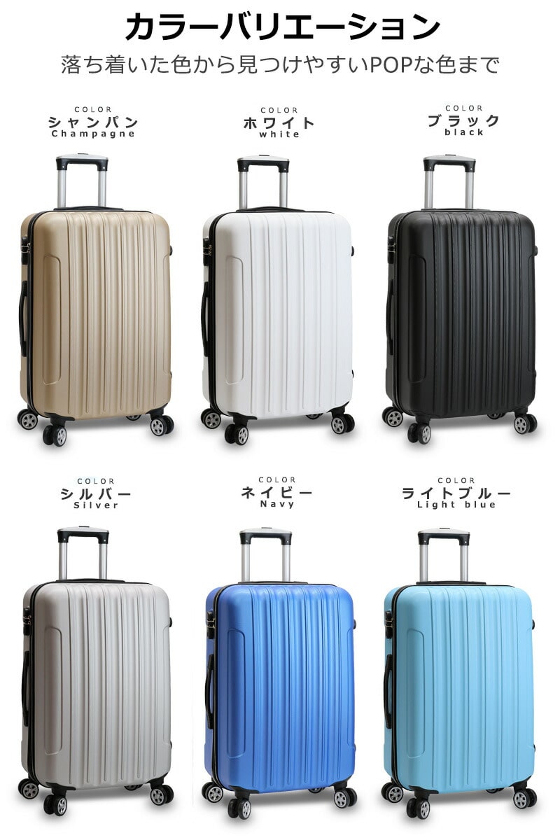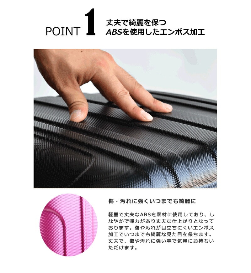 スーツケース本体の素材には軽量で強度も強く壊れにくいABS素材を使用し ております。旅行では絶対に必要なスーツケースだから、丈夫で永く使える ものを選びたいですよね。