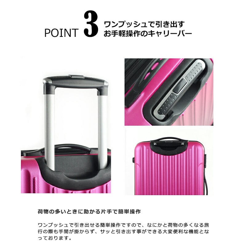 プッシュボタンを押して引き伸ばせるキャリーバー。片手で簡単に操作でき、 旅行時の荷物の多い時でも片手で簡単に操作ができるうれしい仕上がりです♪