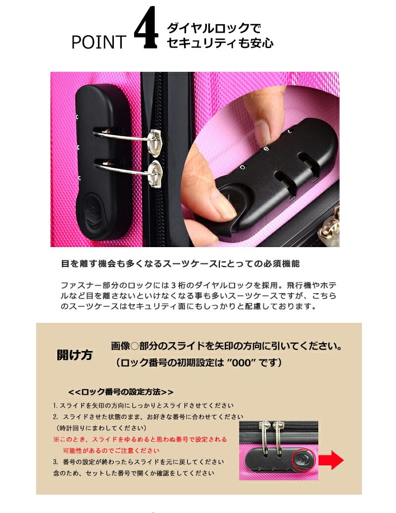 ファスナー部分のロックには3桁のダイヤルロックを採用しております。飛 行機やホテルなど目を離さないといけなくなる事が多いスーツケースですが、 こちらのスーツケースはセキュリティ面にもしっかりと配慮しております。