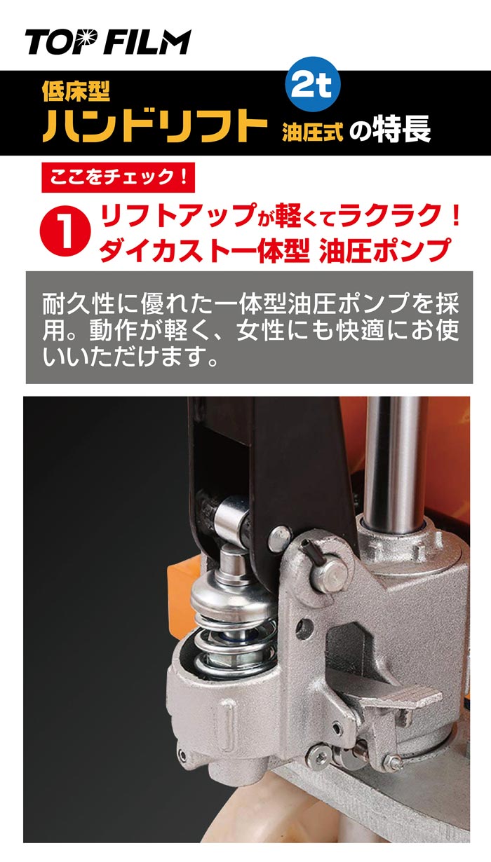 ●リフトアップが軽くて楽々! ダイカスト一体型油圧ポンプ