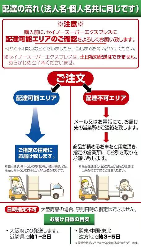 お届け先が配達不可エリアの場合、お客様にお車をご用意して頂き、ご指定の営業所に商品引取りをお願いする場合がございます。