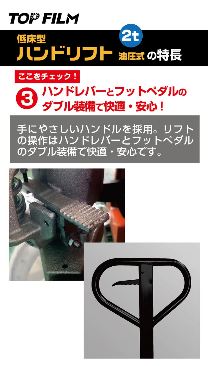 リフトの操作はハンドレバーとフットペダルのダブル装備で快適・安心です。