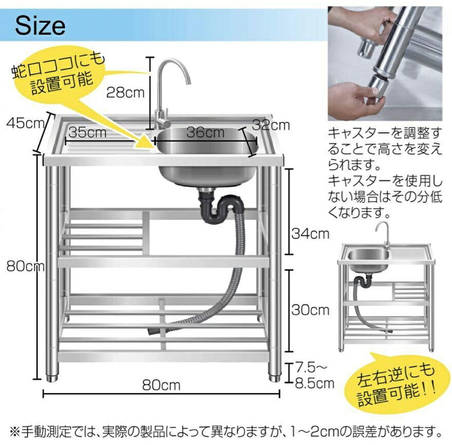 * 庭先やベランダ、アウトドア、キャンプ、工事現場など活躍の場は様々。お庭でのガーデニングやBBQなどで活躍する流し台。サビに強いステンレス製なので、屋外でも安心して使えます。蛇口付きで台所に近い感覚で使うことができ、深型シンクと作業台もあるため用具の水洗いや野菜洗いなどに最適!