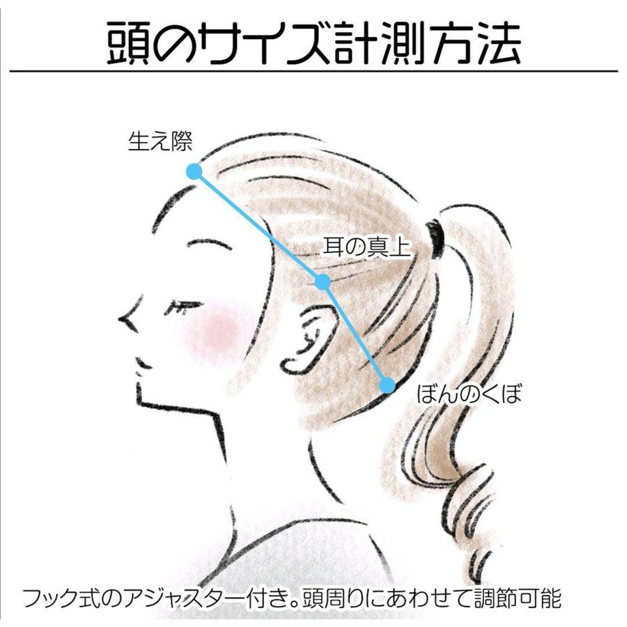 フック式のアジャスター付き。頭周りにあわせて段階調節可能 頭周り:約55-58cm。