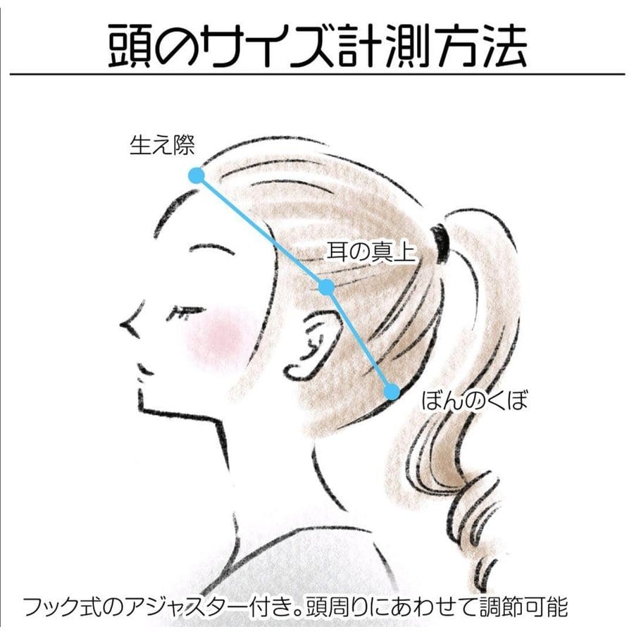 フック式のアジャスター付き。頭周りにあわせて段階調節可能 頭周り:約55-58cm。