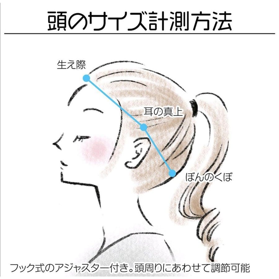 フック式のアジャスター付き。頭周りにあわせて段階調節可能 頭周り:約55-58cm。