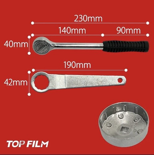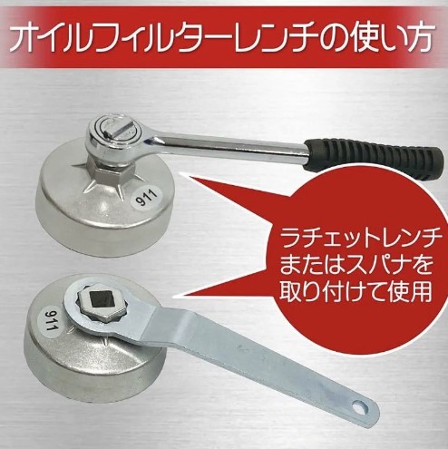 作業環境によりオイルフィルタレンチを駆動させる工具が選べるよう、差込角(9.5sq.)と六角部(二面幅24mm)付きです。