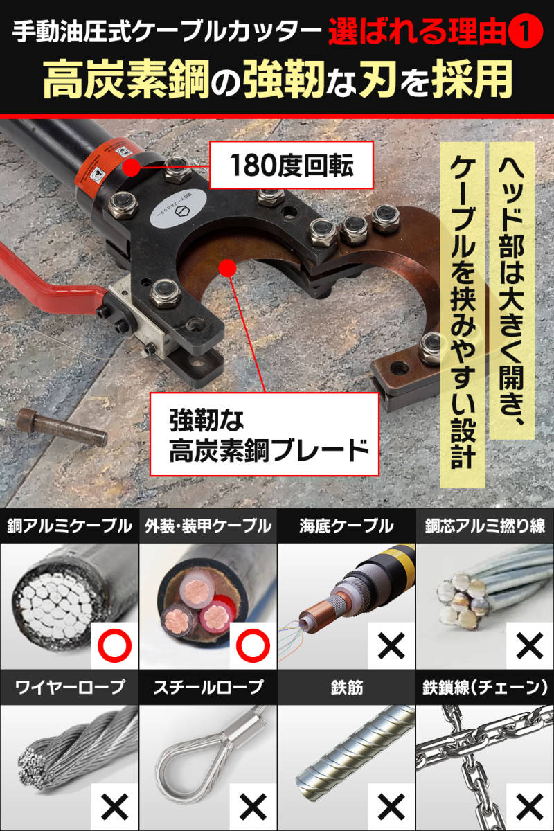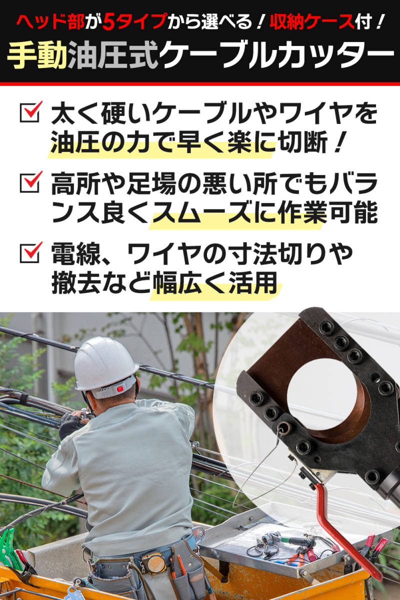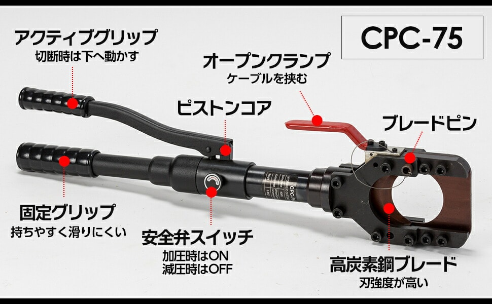 【製品特徴】油圧ON⇔OFFのみの操作で、簡単にケーブルを切断する事ができます。ブレードは銅材に特殊な焼き入れを行い、切れ味抜群で高寿命・高耐久を実現しております。