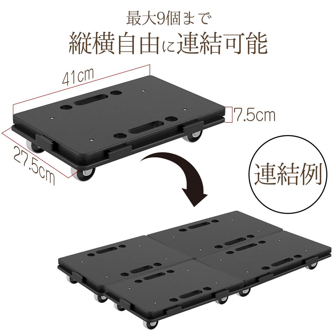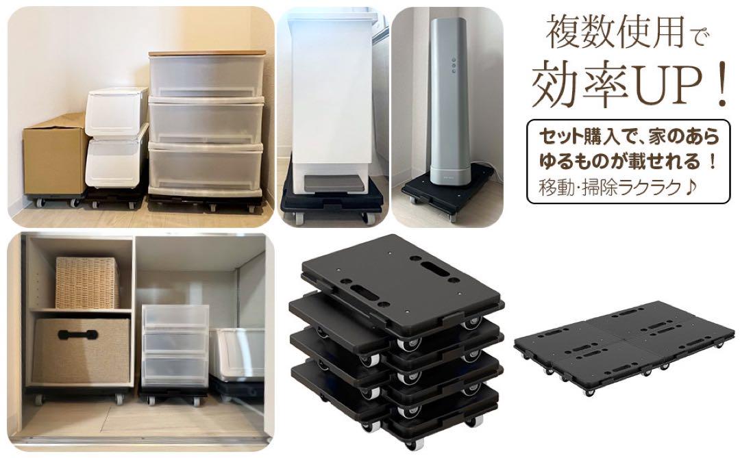 ご家庭では家電、衣装ケース、米びつ、飲料ケース等の移動をスムーズに行えます。オフィスではコピー用紙、配達物。 工場では機械類。 アウトドアではクーラーボックス、コンテナボックス等 様々な場面であらゆるものを載せて運ぶことができます。台車の高さが地上高約7.5cmと非常に低く設計されているため簡単に積載できます。