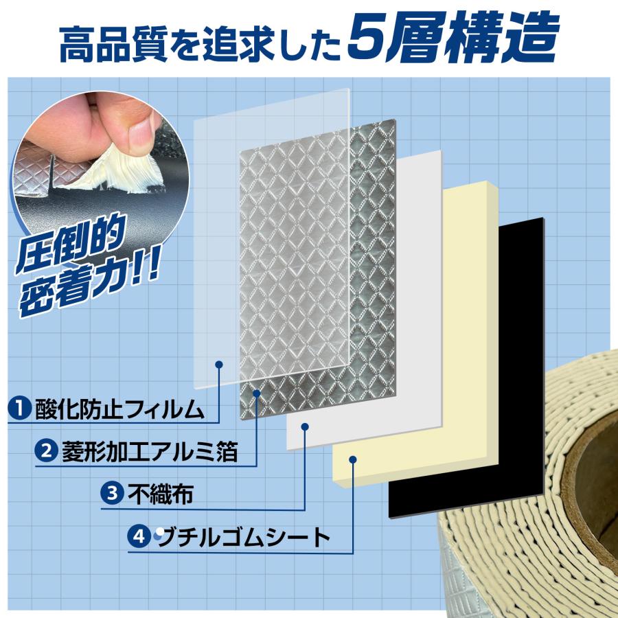 5層構造:酸化防止フィルム+菱形加工アルミ箔+不織布+ブチルゴムシート+保護フィルム。