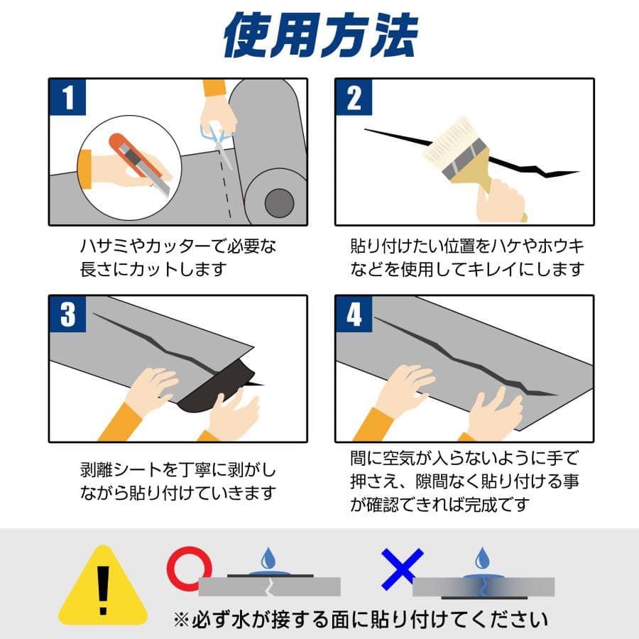 ・水漏れ箇所を確認し、水漏れの隙間が完全に覆うようにしてください。コンクリートのひび割れには、幅約10cmまたは  約15cmのテープをはる貼ることをお勧めします。