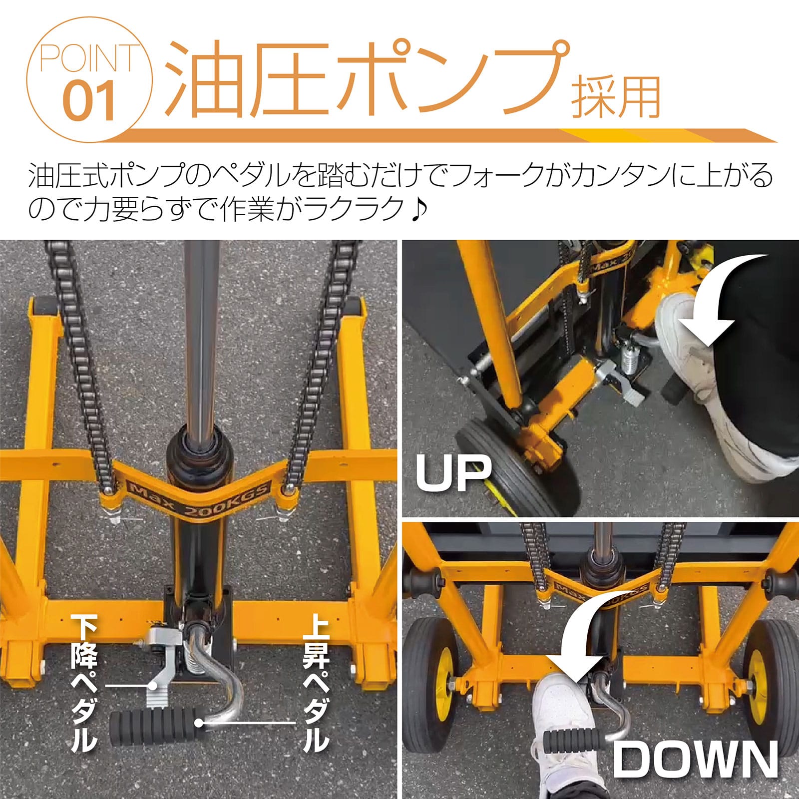油圧ポンプ式なので、ペダルを踏むだけでフォークが簡単に上昇します。