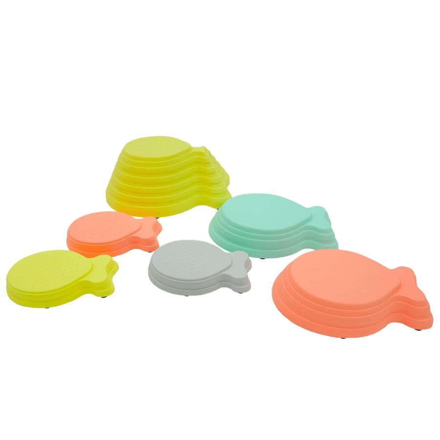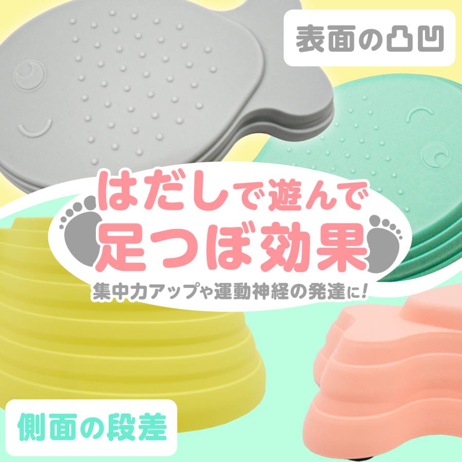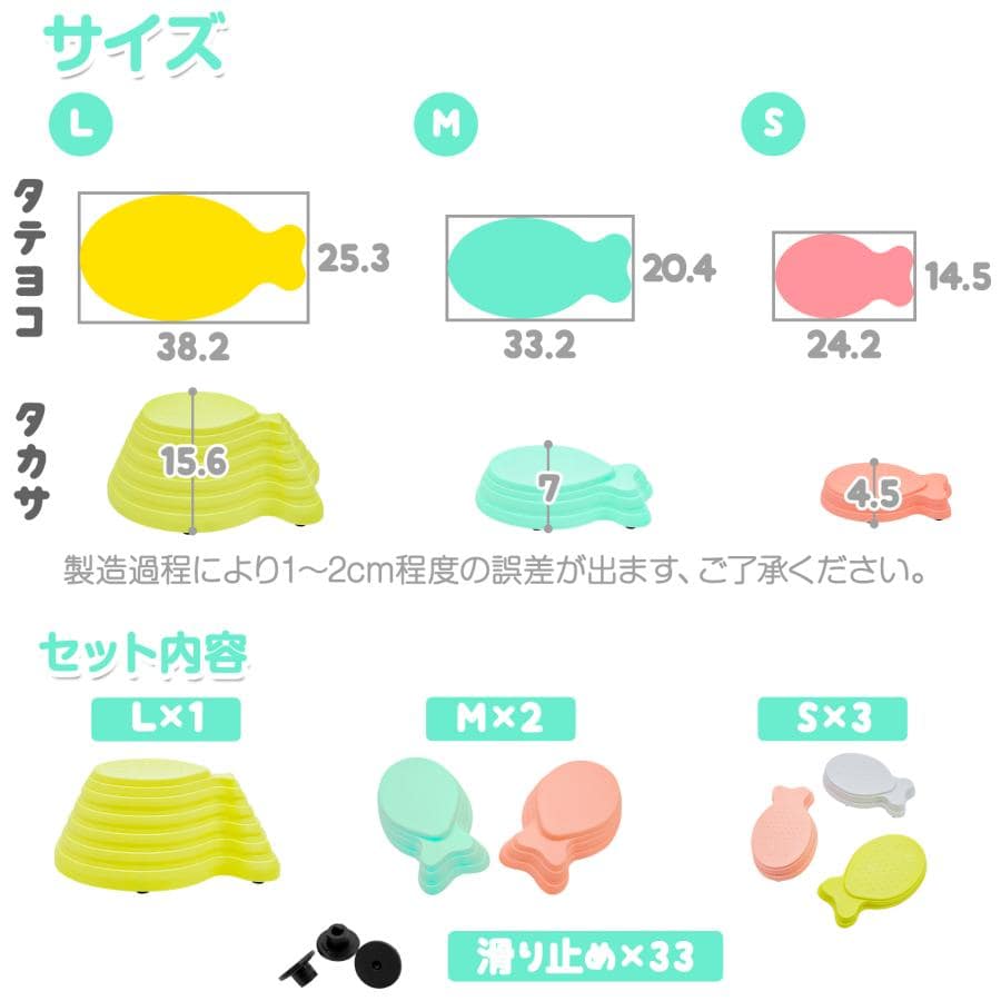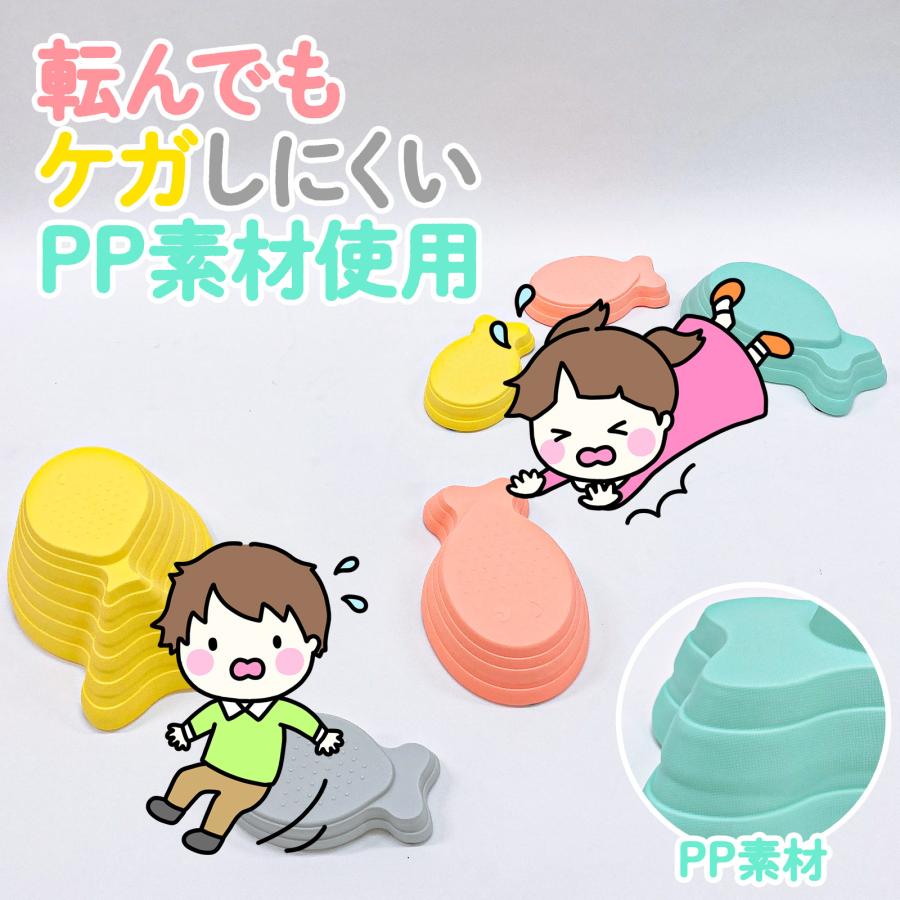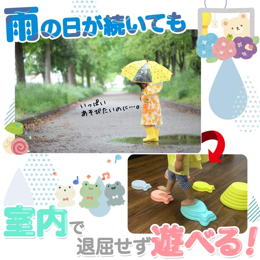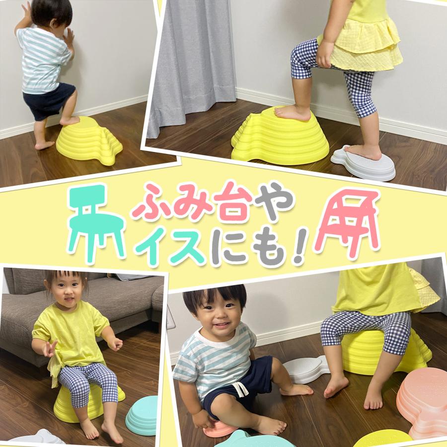 高さや大きさが異なる6個のストーンを飛び移りながら、楽しく体幹・バランス感覚が身に付く知育玩具。