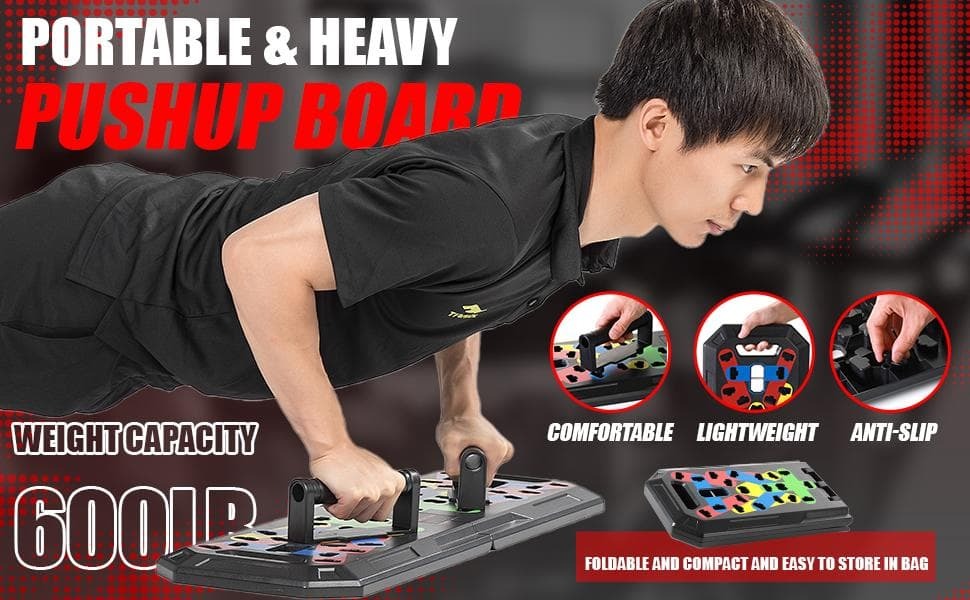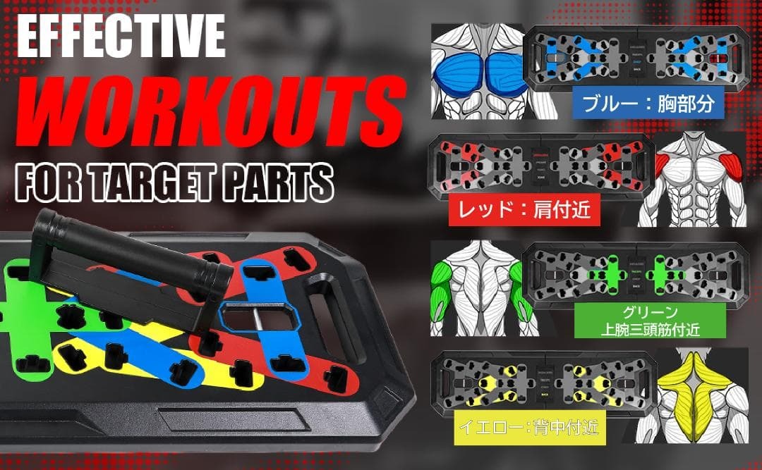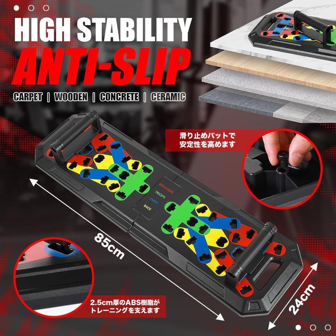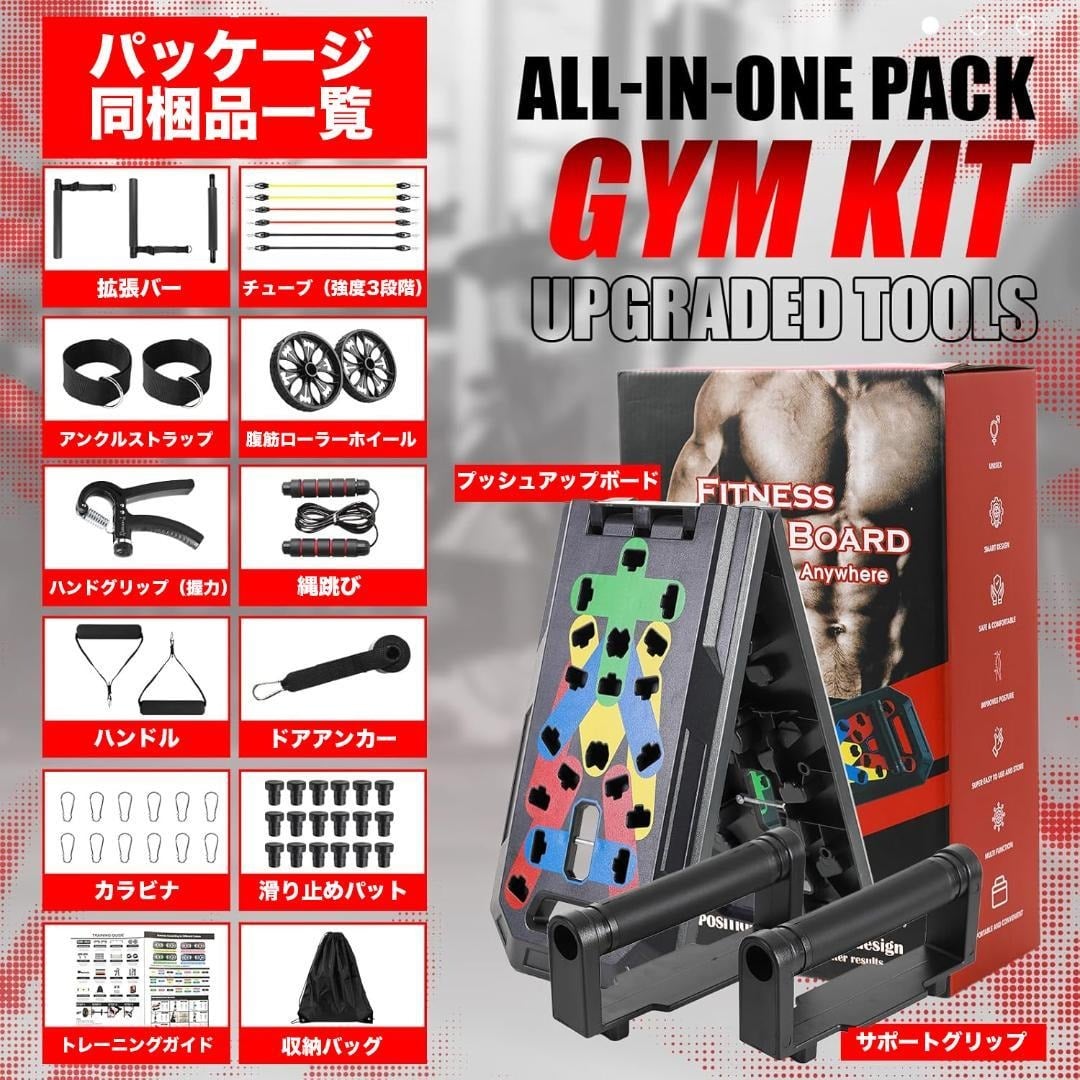 【アメリカで大人気】全身トレーニングのオールインワンパッケージ!折りたたみ式マルチプッシュアップボード、拡張バー、3段階レジスタンスバンド、アンクルストラップ、ドアアンカー、腹筋ローラー、握力グリップ、縄跳びを含む多機能セットで、色分けデザインにより胸筋、上腕三頭筋、肩、背中、下半身を効果的に鍛え、持ち運び可能なコンパクトホームジムとして自宅や旅行先でも使用可能、軽量で安定性があります!