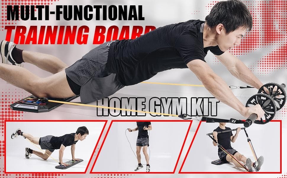 【アメリカで爆発的人気!!】折りたたみ式プッシュアップボード、拡張バー、強度3段階のレジスタンスバンド、2つのアンクルストラップ、ドアアンカー、腹筋ローラー、握力グリップ、縄跳び!コンパクトなホームジムとしてほとんどのトレーニングニーズを満たすことが可能!