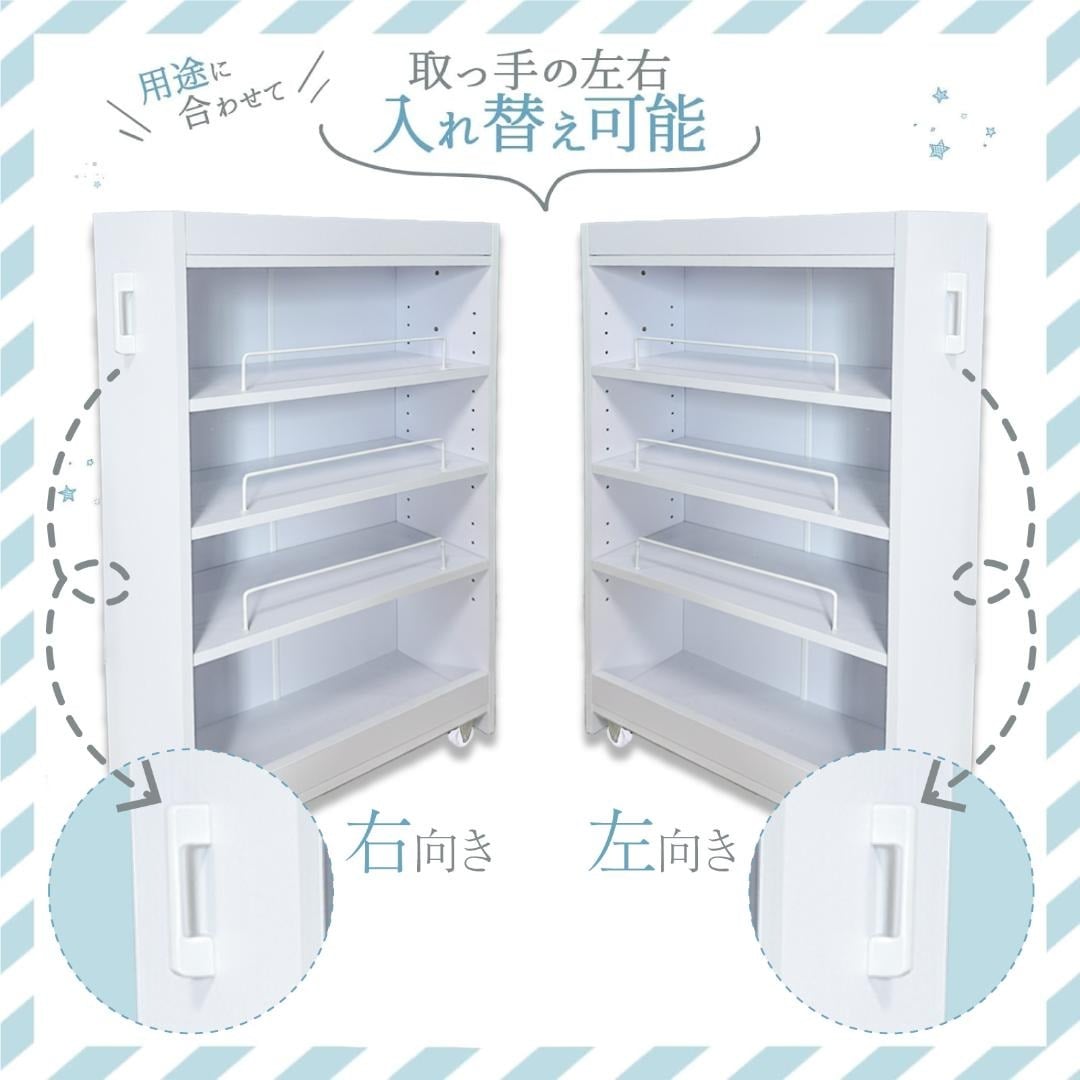 【左右どちらでも使える利便性】 取っ手は左右どちらにも付け替え可能。 冷蔵庫の右側・左側、どちらに設置しても使いやすくレイアウトできます。 キャスター付きで移動もスムーズ。 模様替えや掃除の際も手軽に動かせるので、日常の使いやすさを追求した仕様です。