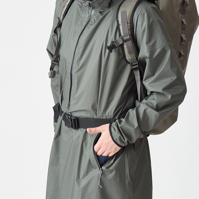 長いファスナーは着脱しやすく、腰のスルーポケットはパンツポケットに直接アクセスできるだけでなく、ベンチレーションとしても活躍。