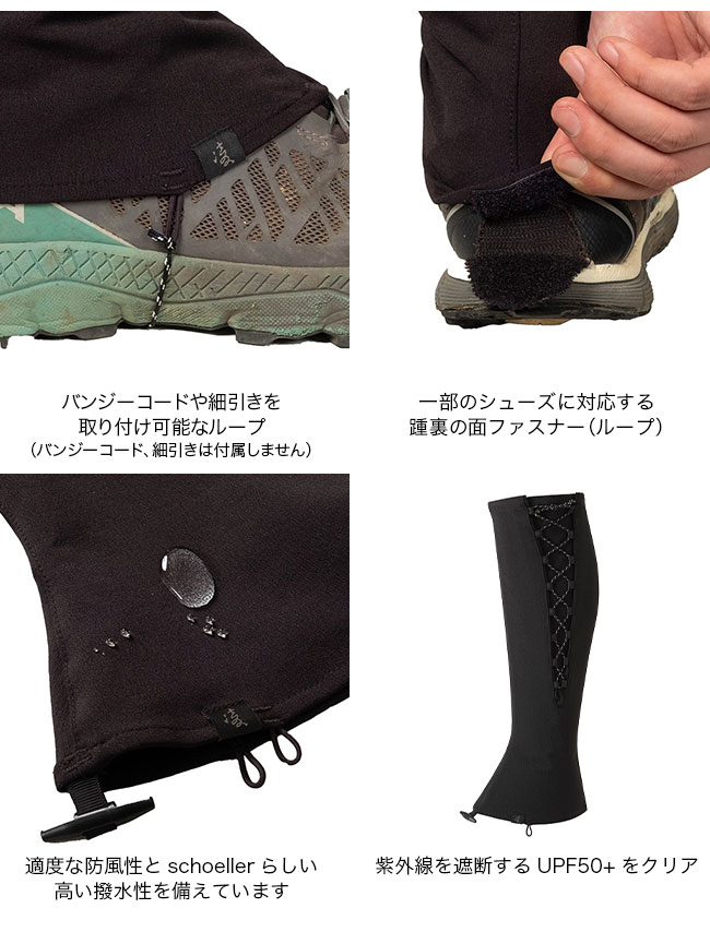 丈夫で耐摩耗性に優れる素材は、ゲイターに必要な強度を充分に備えています。高い通気性によって不快な蒸れがなく、適度な防風性とschoellerらしい高い撥水性を備えているほかに、紫外線を遮断するUPF50+をクリアしています。