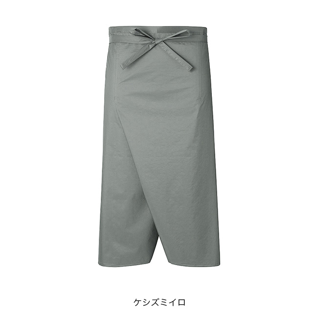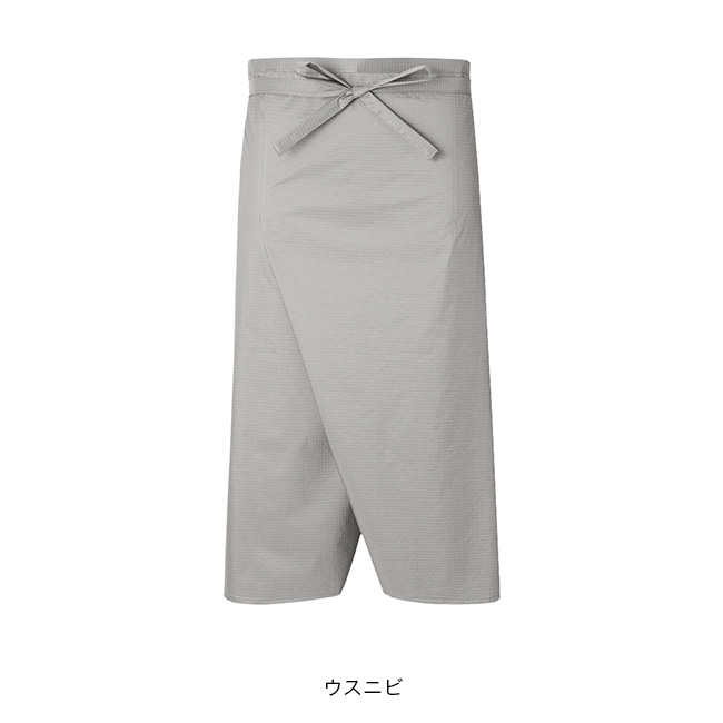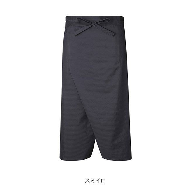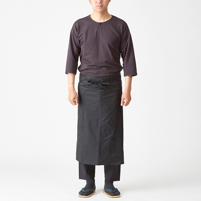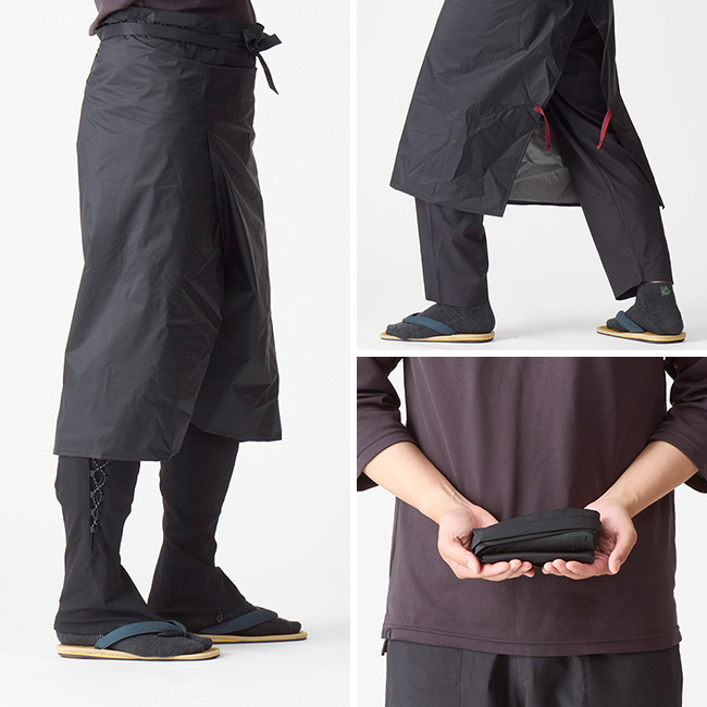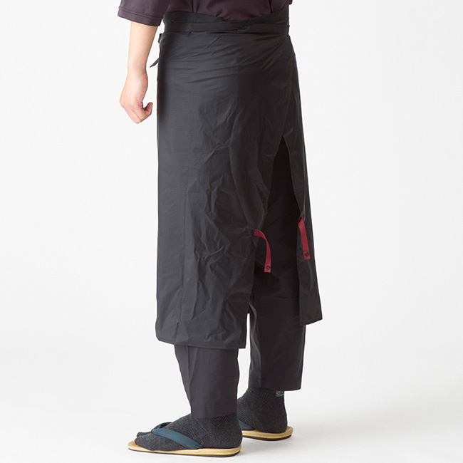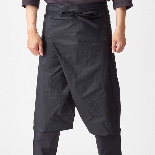 シノギングのフィールドにおいて、レインパンツとは比べ物にならないくらいの運動性とベンチレーション性が実感できて、必要十分な防水性を備えた前掛け型の雨除けです。前掛け型なので後身はカバーしません。後身が開放されているので状況によっては雨に濡れる場合がありますが雨を凌ぐという意味では十分です。少しでも濡れることを避けたい場合にはこの商品を選ばないでください。後身が開放されているので優れたベンチレーション効果と動きやすさを得ることができます。それだけでも十分動きやすいのですが、前中心に生地を重ねて裾を割ることでさらに動きやすさを追求しています。風によるバタつきが気になるときには、脇のテープを膝裏にまわして止めて簡易パンツモードで凌ぐことができます。雨だけではなく風や寒さを凌ぐ事もできるので一年を通して出番の多いアイテムです。