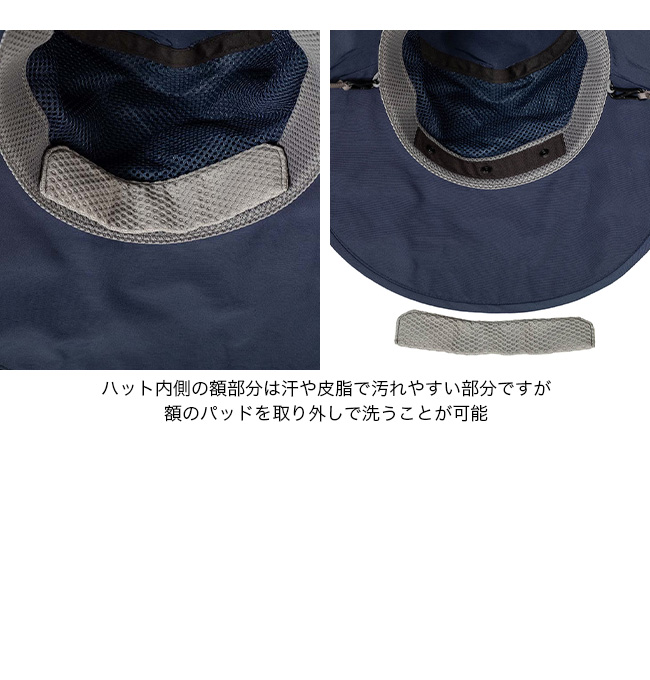 ハット内側の額部分は汗や皮脂で汚れやすい部分ですが、額のパッドを取り外しで洗うことができるのでとても便利です。