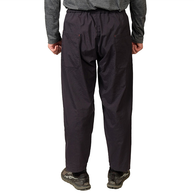 山仕事の作業着として使われていた野良着を再現しているので、ヒップから膝に掛けて少し太めになっていて動きにストレスを感じません。また、膝から裾に掛けて細くなっているので悪い場所での足元確認がしやすくなっています。他に、ナイロンベルトを排除してスッキリしたウェスト周り、バックパックのヒップベルトに干渉せず行動中に使いやすい位置にあるサイドポケットなど、凌ならではのアイデアを足して着心地を向上させています。