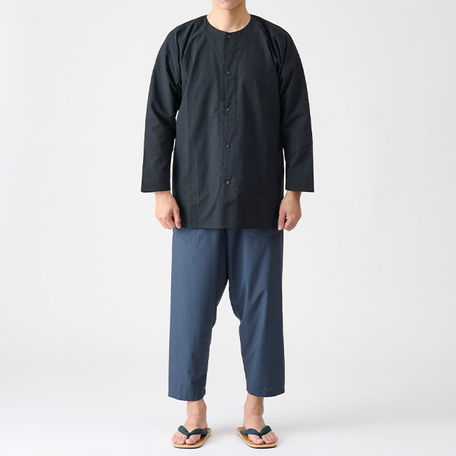 前開きには信頼のYKK Plancerスナップボタンを採用し、生地には涼しくて汗を吸ってくれるしじら織りを選びました。