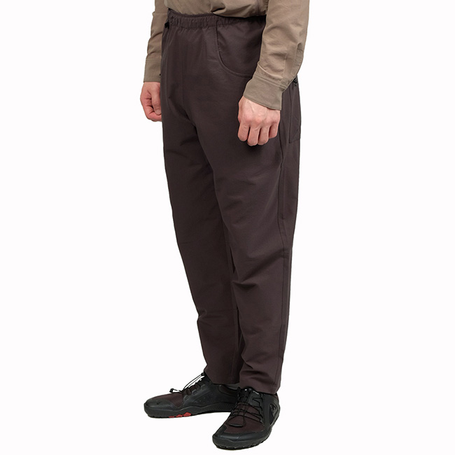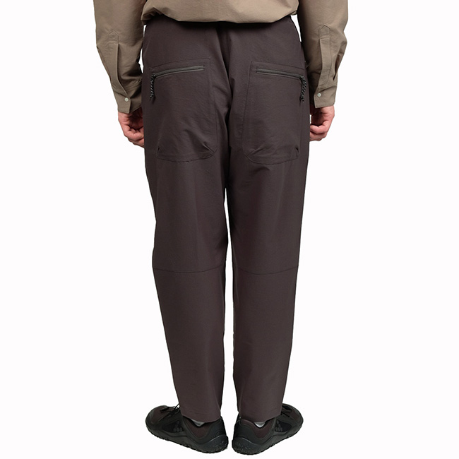 ベルトレスの腰周りはバックパックのヒップベルトと干渉せず、ポケットの位置も低めで使いやすい設計です。